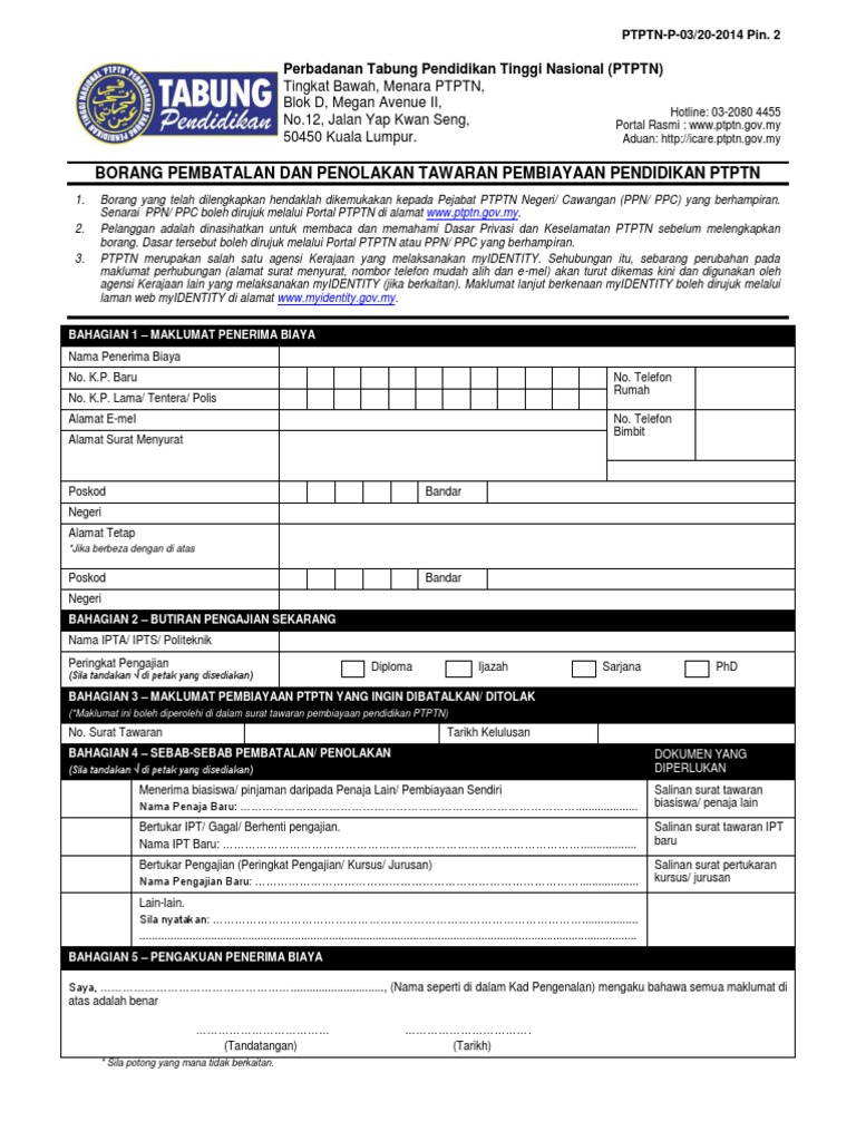 Borang Pembatalan Dan Penolakan Tawaran Pembiayaan Pendidikan Ptptn Pin 2 Pdf Pdf